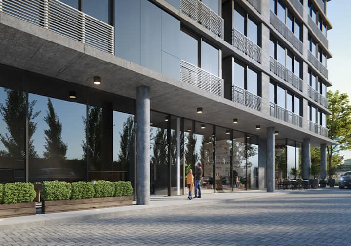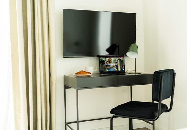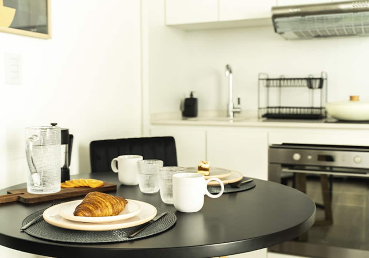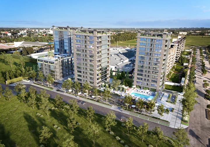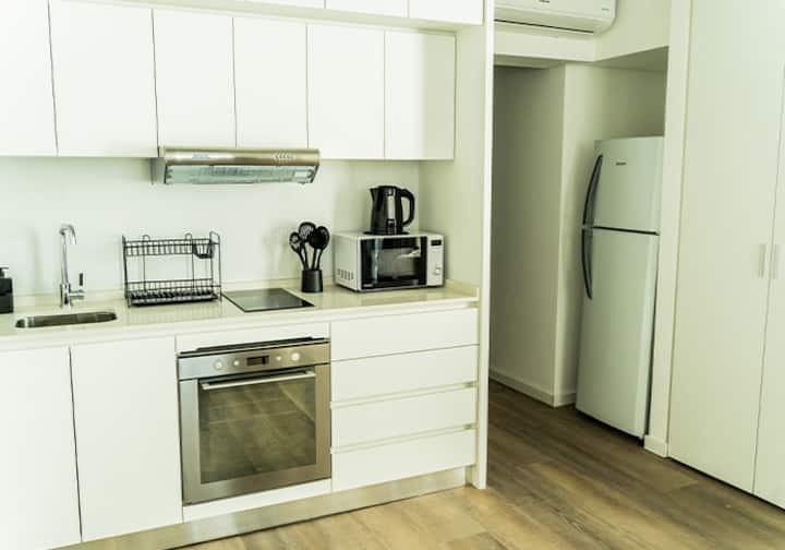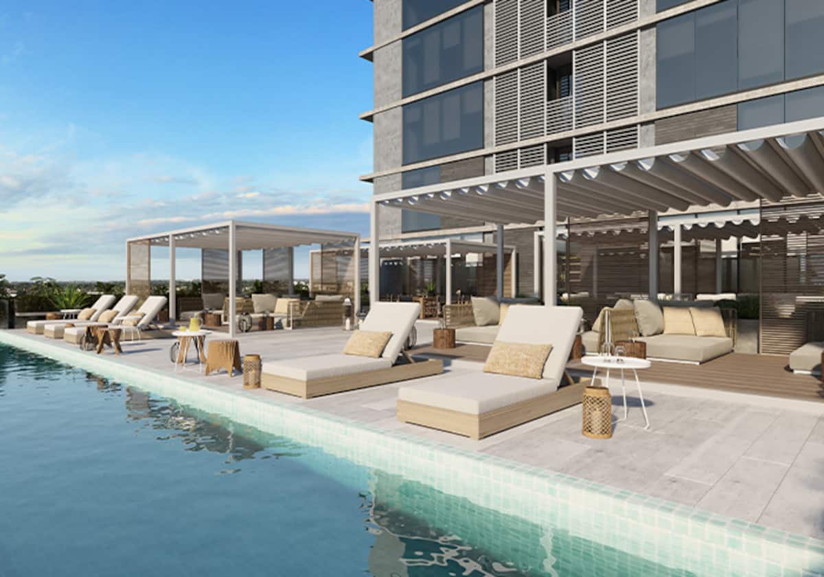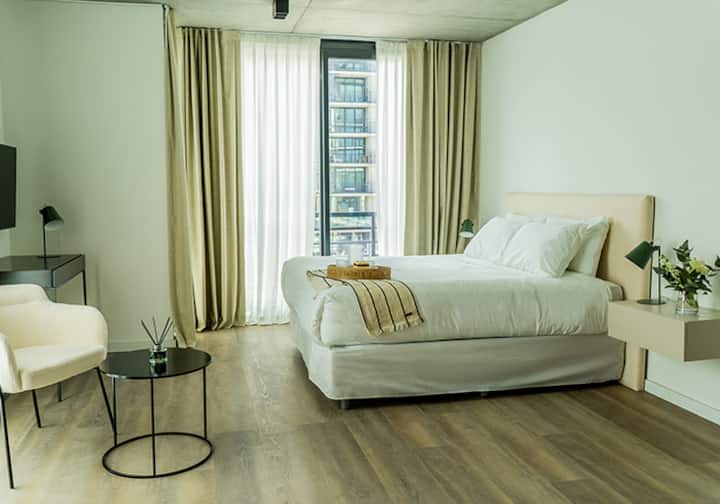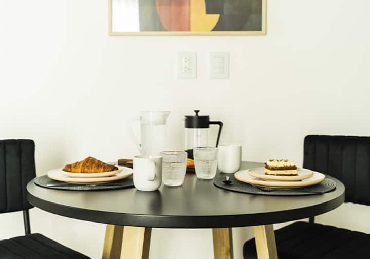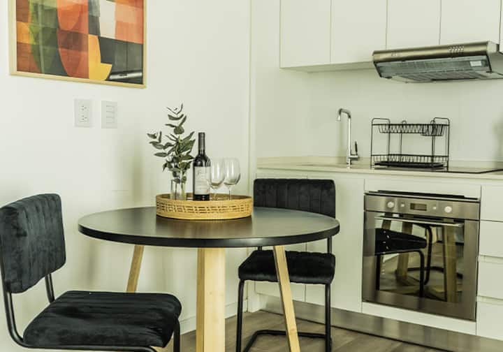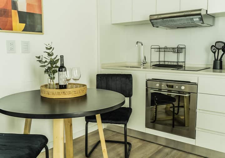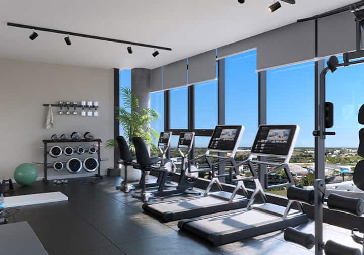 Квартира-студия в Buenavista. Угловое расположение, окна на две стороны и широкий обзор. Встроенная кухня полностью оборудована, установлены кондиционер, Smart TV и Wi‑Fi. В здании есть бассейн, солярий, тренажёрный зал, коворкинг, зона гриля, (закреплённое) парковочное место и общая гостиная для жильцов (SUM).