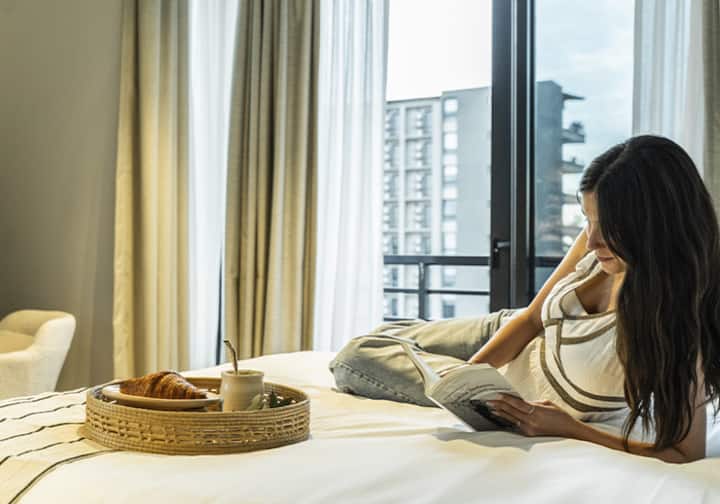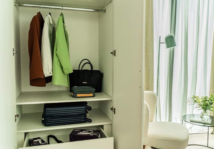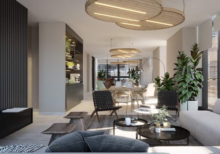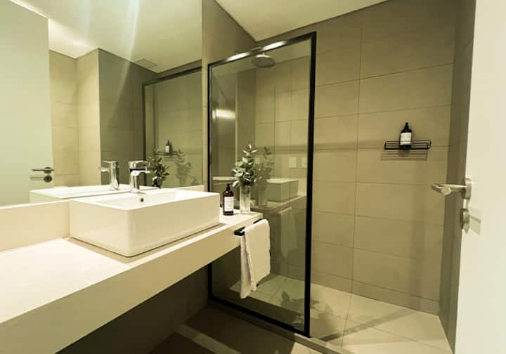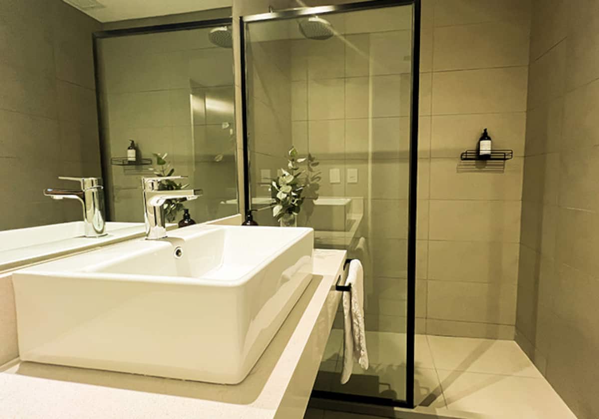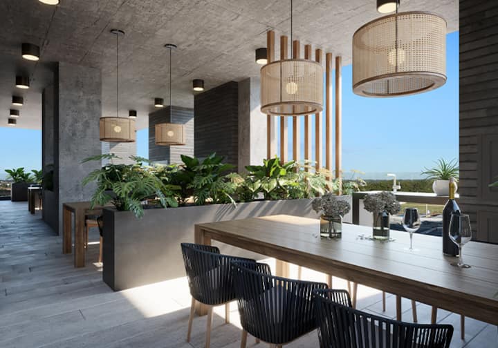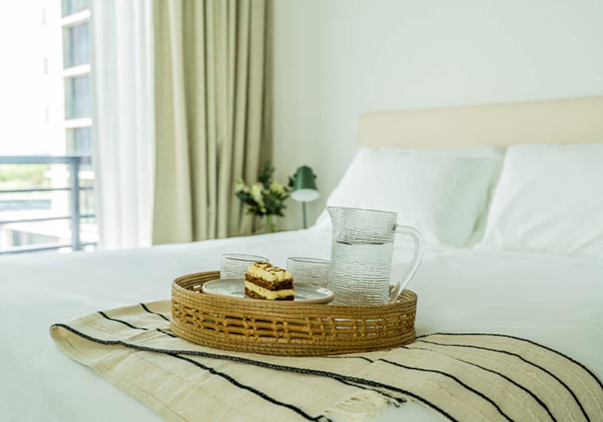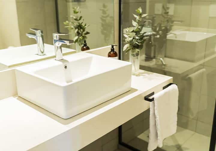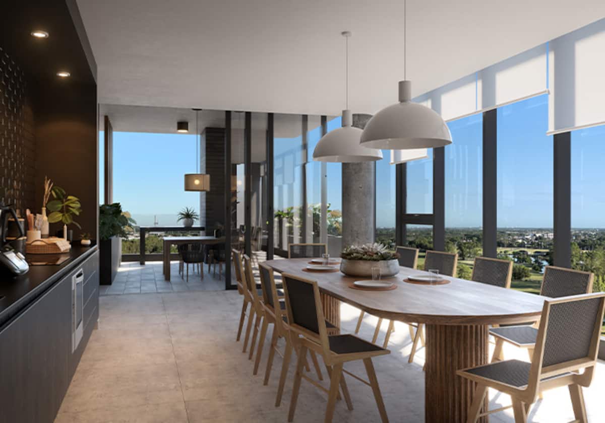 Квартира-студия в Buenavista. Угловое расположение, окна на две стороны и широкий обзор. Встроенная кухня полностью оборудована, установлены кондиционер, Smart TV и Wi‑Fi. В здании есть бассейн, солярий, тренажёрный зал, коворкинг, зона гриля, (закреплённое) парковочное место и общая гостиная для жильцов (SUM).