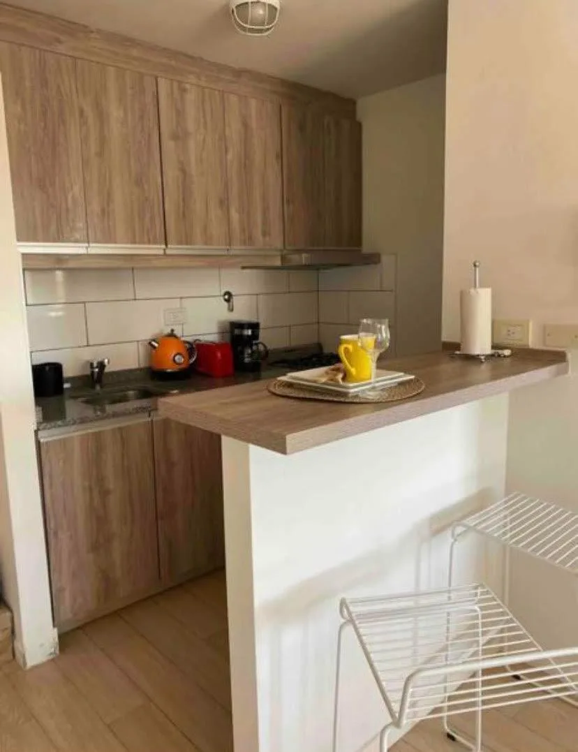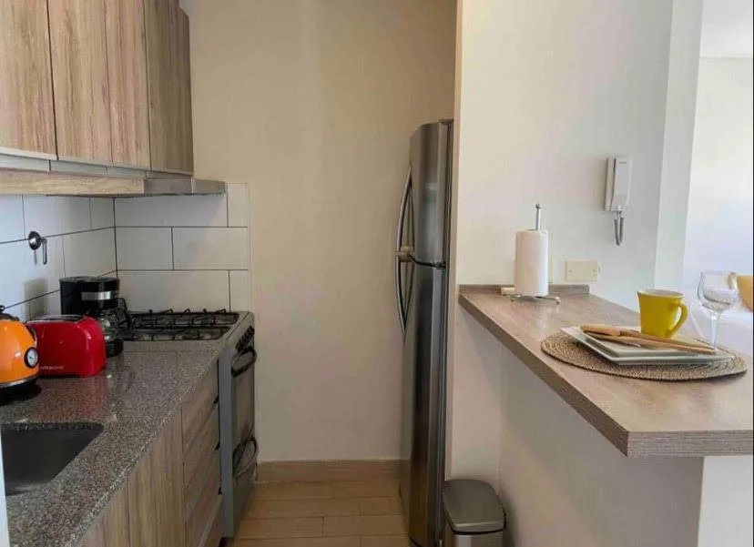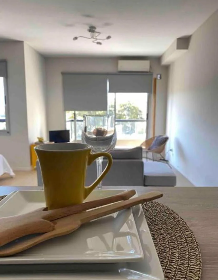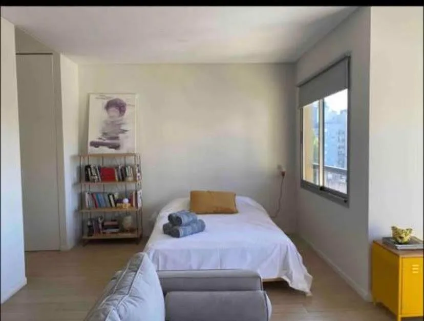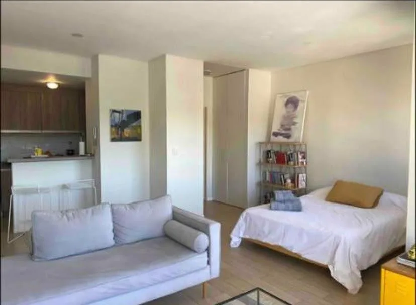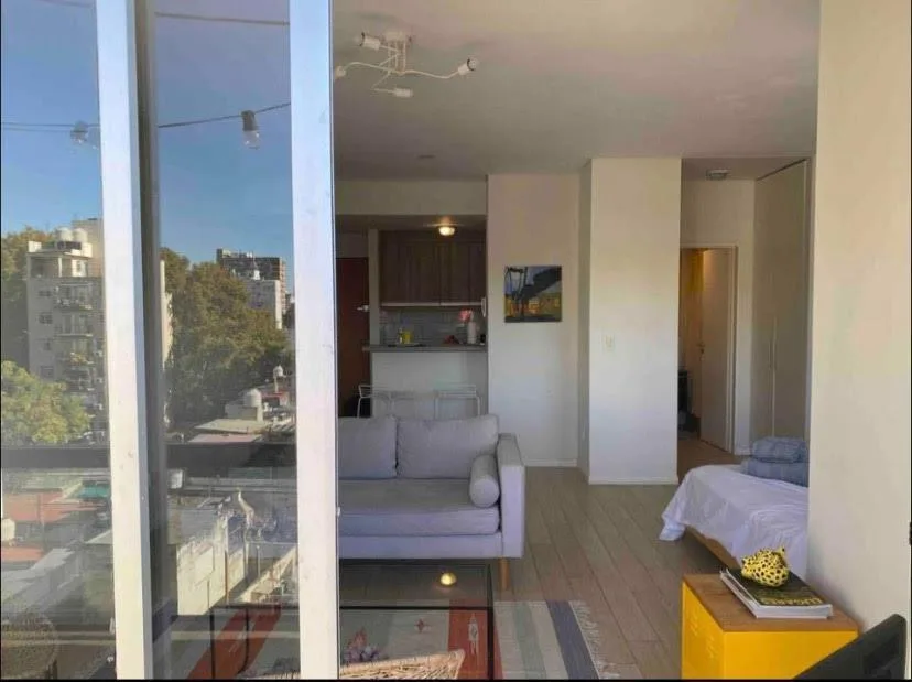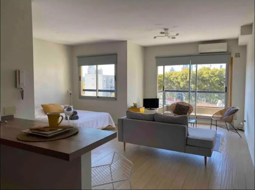 Квартира-студия на верхнем этаже, окна во внутренний двор квартала. Площадь и вид из текста не уточнены; квартира с балконом, меблирована и оборудована. Отопление и холодоснабжение через кондиционер, горячая вода центральная через термонагреватели. Кухня-американка с газовой плитой и газовой духовкой. В здании указаны фитнес-зал, зона гриля и прачечная. Квартирная оплата включает поквартальный перерасчёт по IPC.
