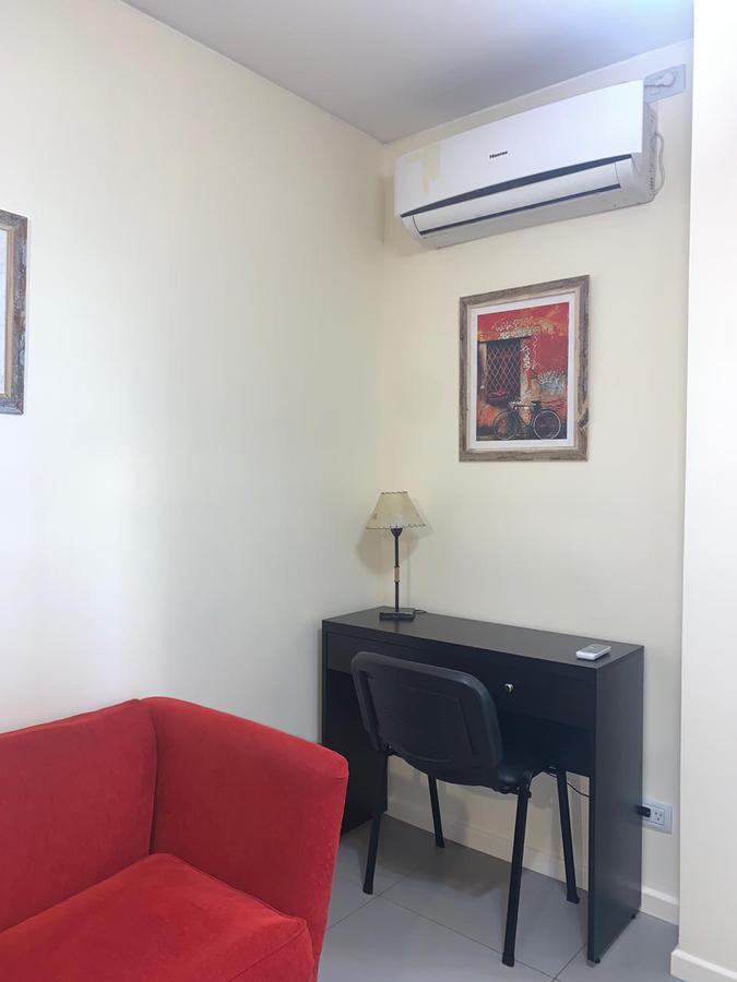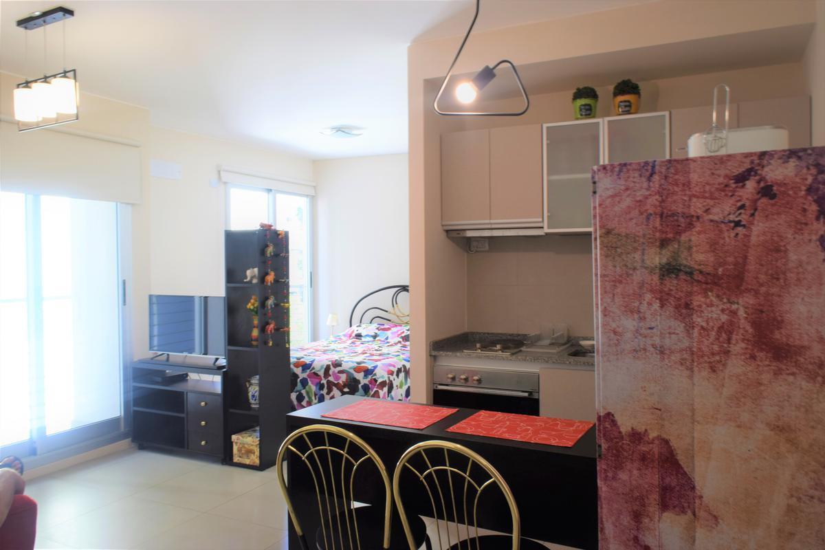 Временная аренда квартиры-студии в Villa Crespo. Площадь указана как «monoambiente», внутри есть зона для сна с кроватью на 2 места с ящиками по бокам, шкафом, прикроватными тумбами и лампами, модульным хранением и телевизором Smart 32 дюйма. Обеденная и рабочая зона оборудованы диваном на два корпуса, журнальным столом, письменным столом, барной стойкой; кухня с электрической духовкой, конфоркой, холодильником, микроволновой печью, тостером, электрическим чайником и полным набором посуды. Ванна