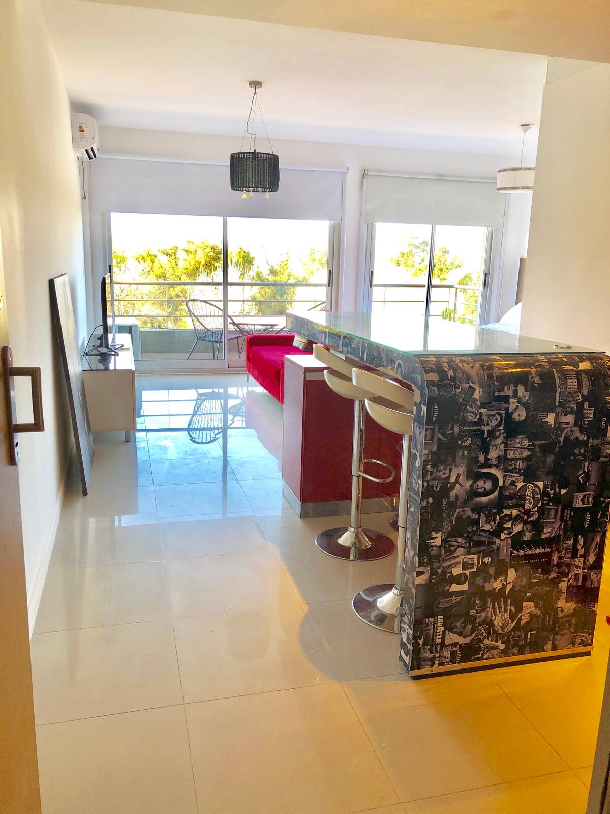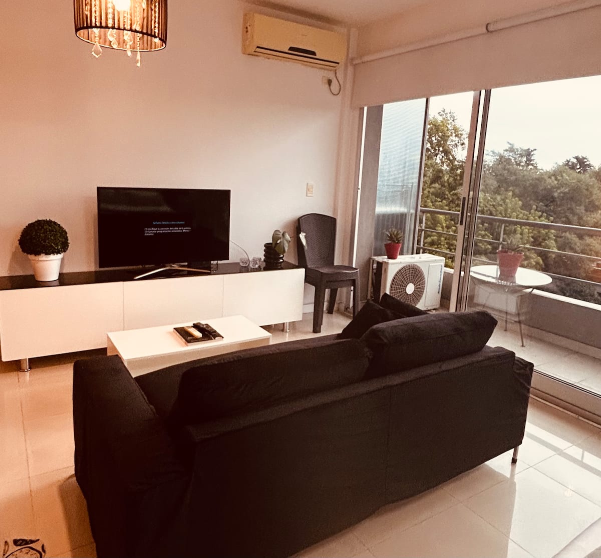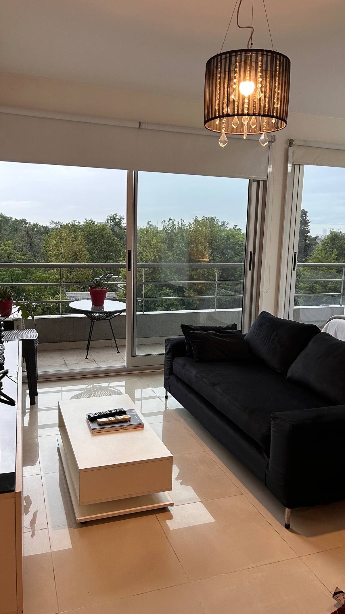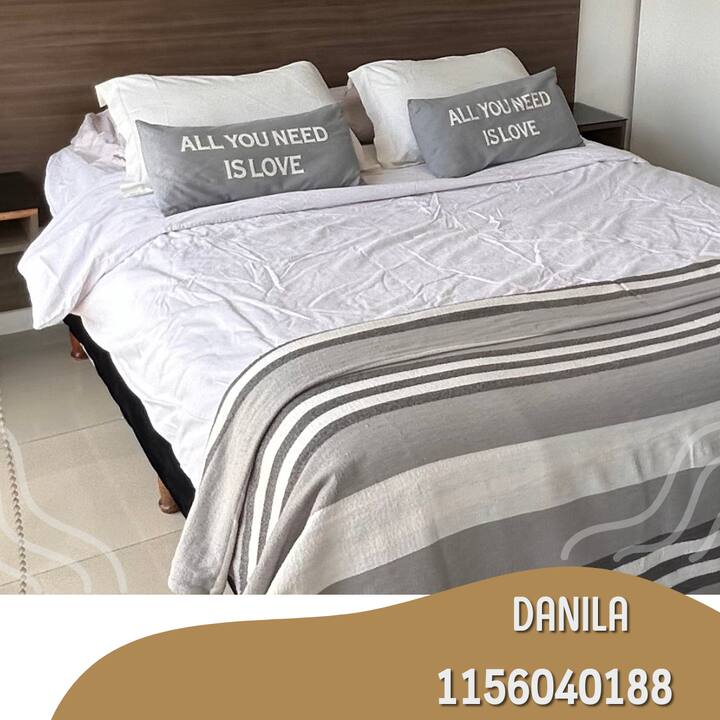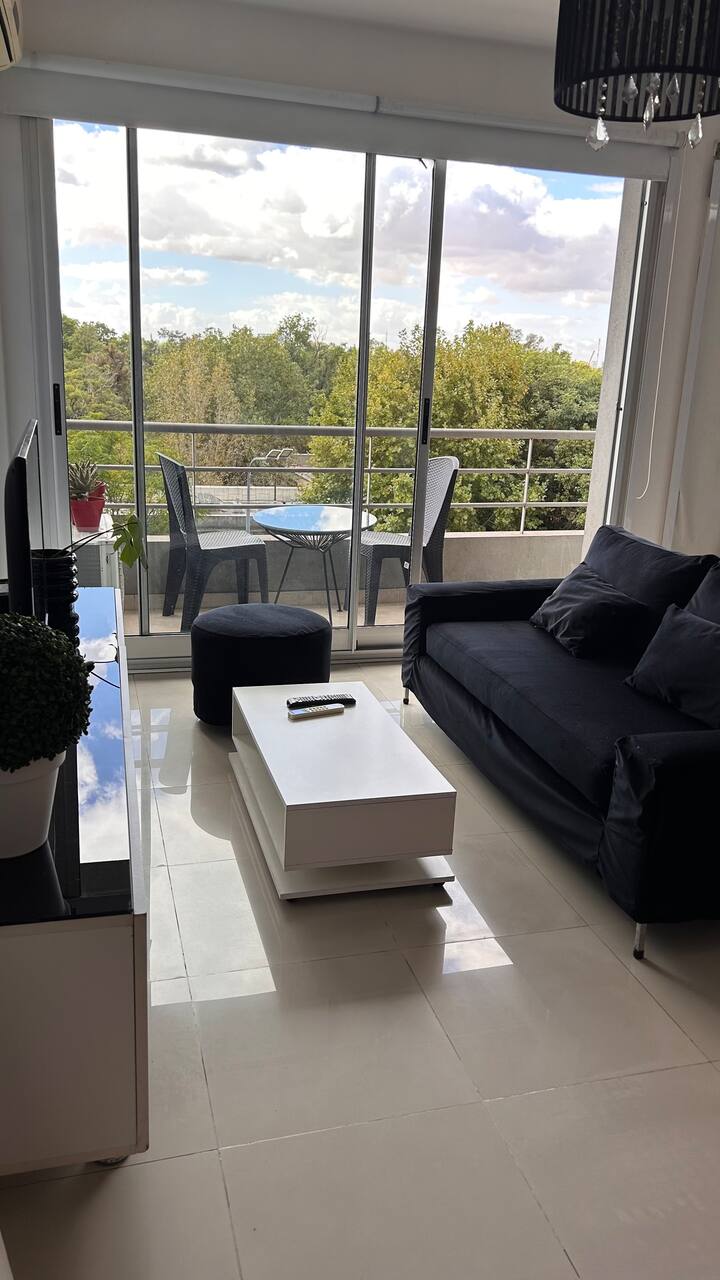 Квартира-студия (loft) в Villa del Parque, окна на улицу, с длинным балконом. Указана панорамная видимость. В описании сказано, что помещение новое. Приведены сведения об оснащении текстилем: простыни, полотенца и постельное бельё из 100% хлопка.