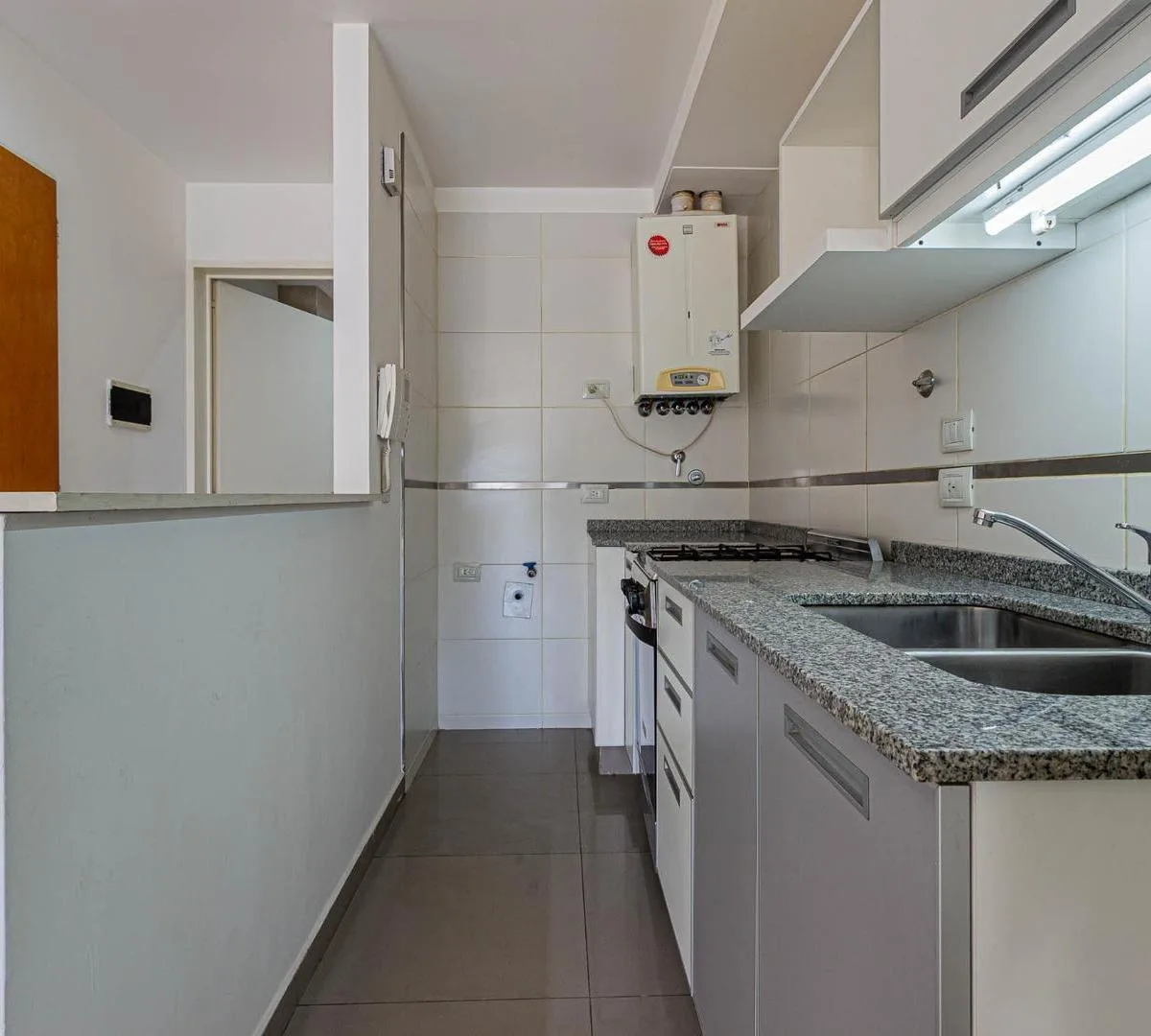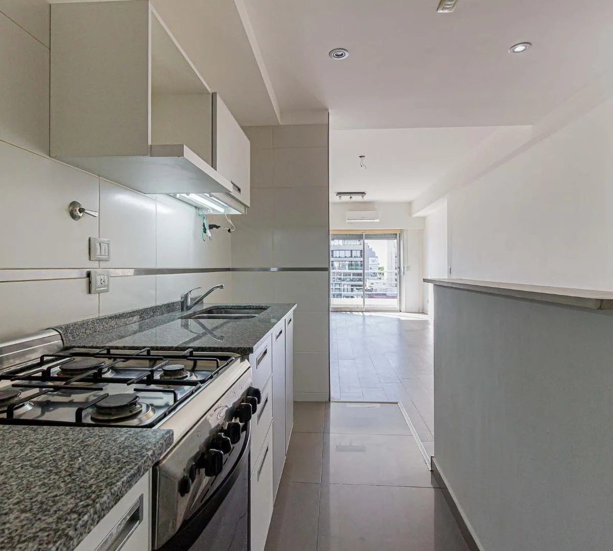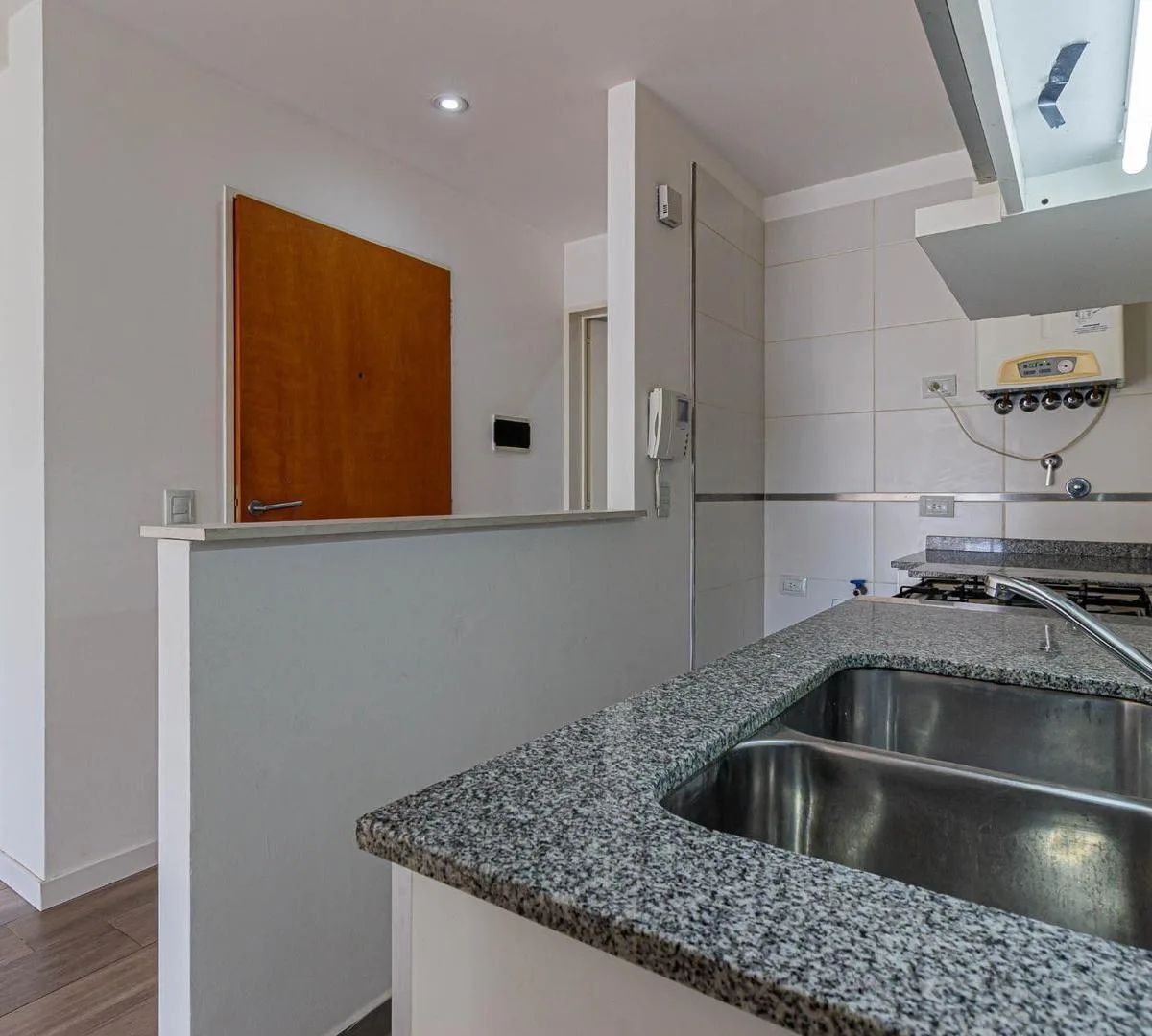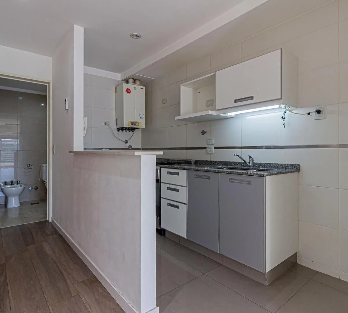 Квартира-студия площадью не указана в здании небольшой этажности от Desarrolladora Porchetto, 6-й этаж. Окна на северо-восток, дневное солнце большую часть дня. Пространство «гостиная-студия-спальня» с выходом на балкон с открытым видом, напольное покрытие под дерево (керамогранит). Кухня с барной стойкой, предусмотрено подключение для стиральной машины, есть газовая плита (anafe), духовка и двухконтурный котёл для горячей воды и индивидуального радиаторного/теплого пола (losa radiante). Установ