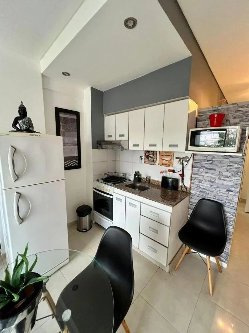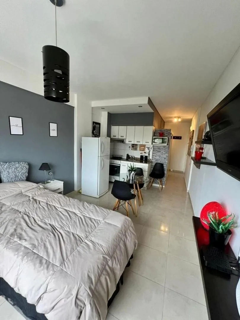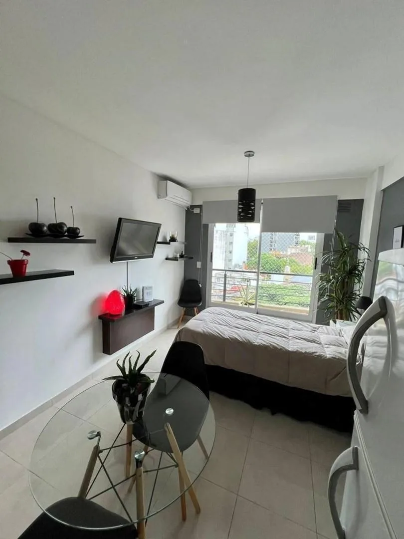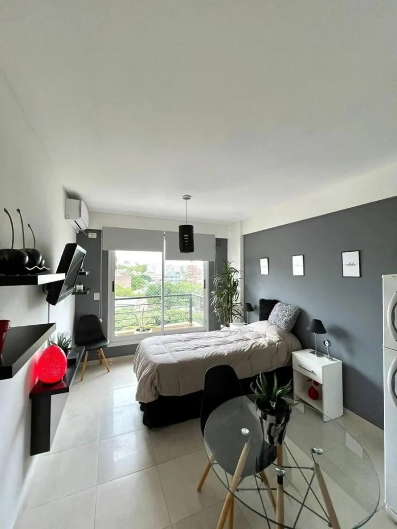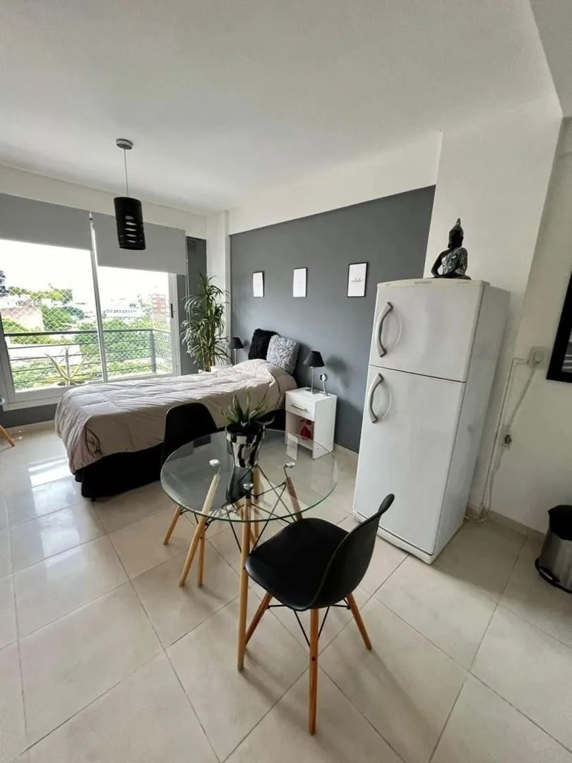 Квартира-студия площадью не указана, с мебелью. Кухня интегрирована, есть полноценная ванная комната, предусмотрено подключение для стиральной машины. В гостиной-зоне установлено соединение для вывода на балкон: балкон выходит во двор (окна во двор) с сеткой от насекомых. В стоимость аренды входят электроэнергия, газ, коммунальные платежи здания, ABL и Wi‑Fi; expensas указаны как $150.000.